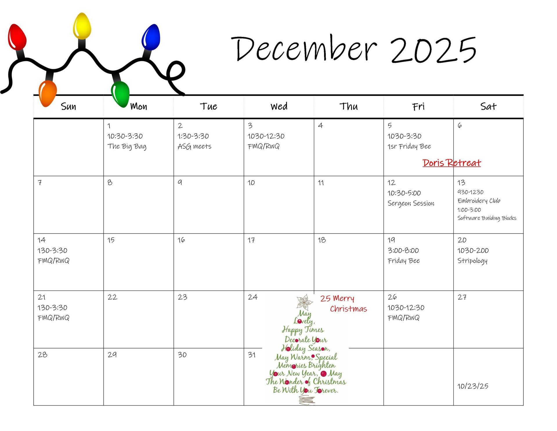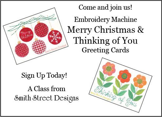 Embroidery Club Cindi Luther, instructor. We are now working with Smith Street Designs "Project Portfolio 2" a 6 session program that uses different in the hoop techniques to build your embroidery confidence. In our December session will complete this series with embroidered greeting cards. How much more personal could you get? Open to all brands of embroidery machines as long as you know how to operate the machine. Next session is Saturday, December 13, 9:30-12:30. $15.00. The design is included in the class fee. Supply list will be emailed to you after you register for the class.