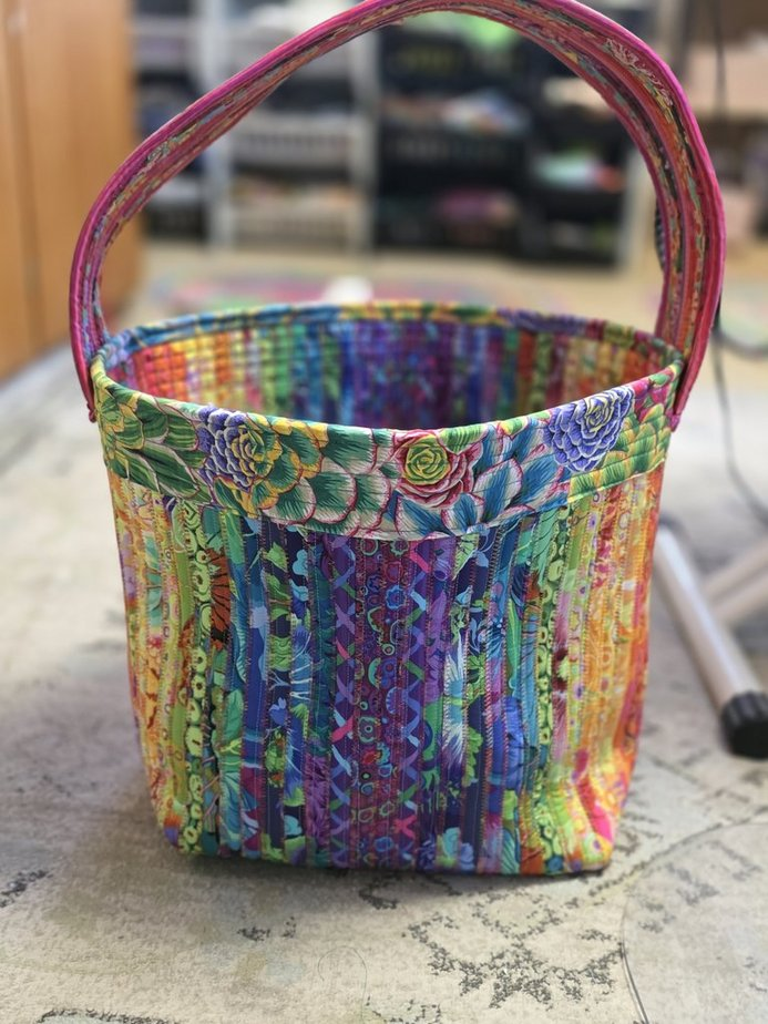 This bag is HUGE. It stands 14" tall and has 24" opening to get all your goodies in. All it takes is One Jelly Roll, One roll of 2 1/2" Batting, Some extra fabric for handles and that's all you need!!